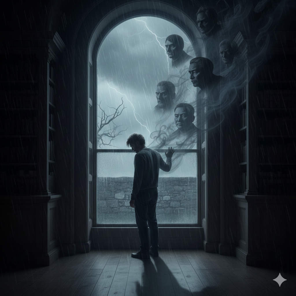- English: In a grand cosmic library with gears of causality turning, a person in sophisticated modern ceremonial robes writes their own life story with a glowing pen. The dark shadows at their feet transform into transparent crystals and shatter under the light of wisdom, while their gaze emits a warm golden light toward all of humanity through a window.