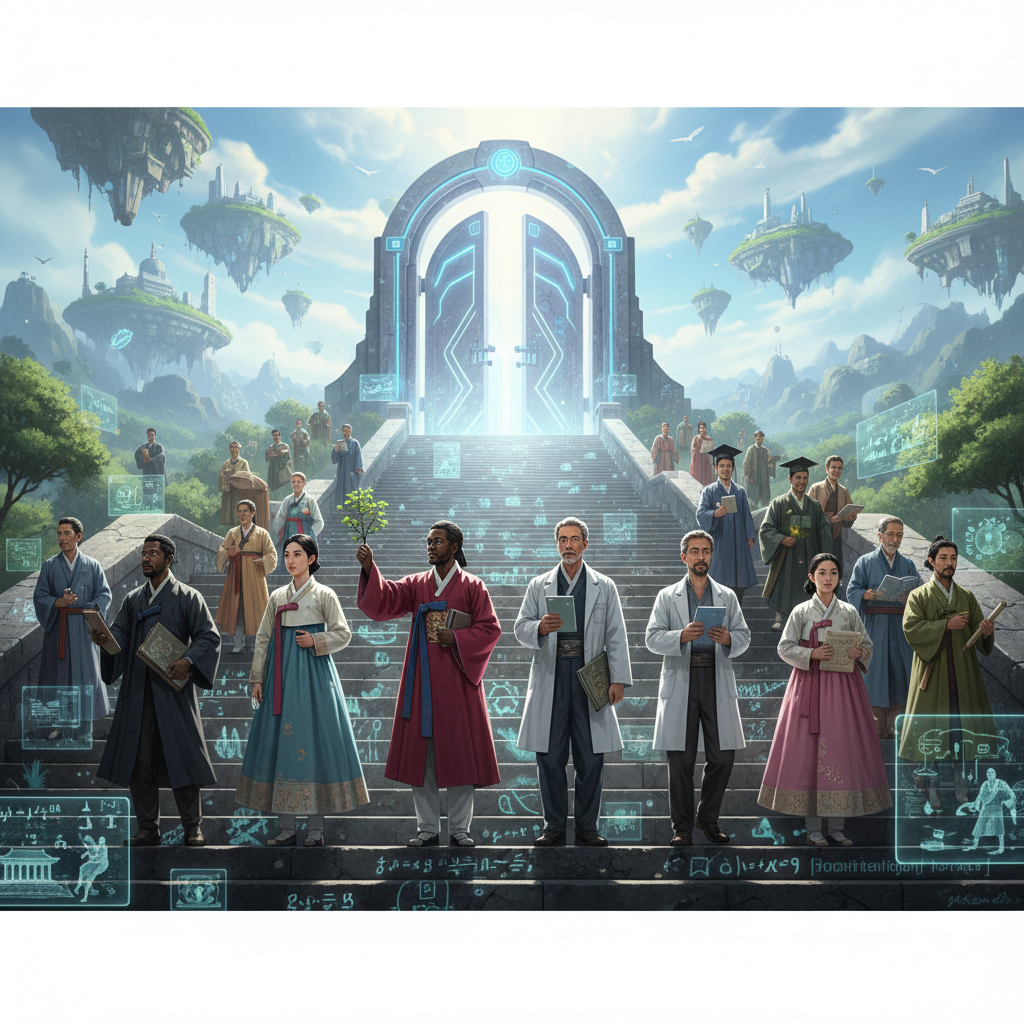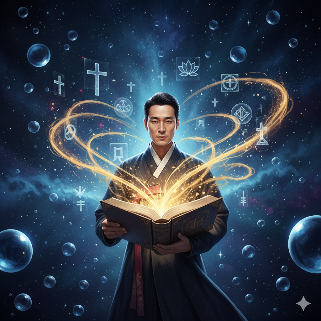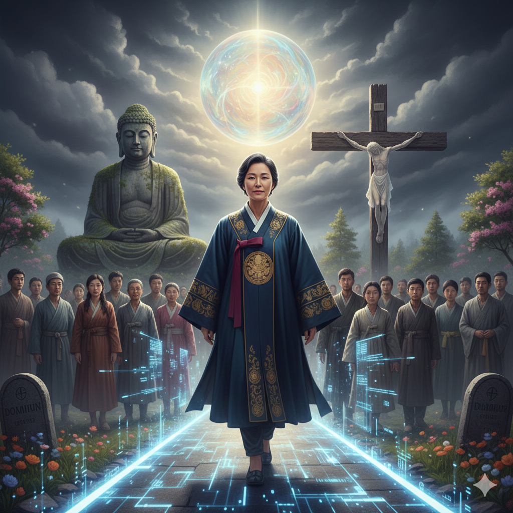 - Prompt (English): A fusion of a cosmic data center and an ancient temple. In the center, a massive server of light representing 'non-material elemental energy' emits data strands that pass through historical scenes (Jesus praying, slave processions, modern labs). A Hongik Ingan leader in modern Hanbok weaves these strands into a golden fabric of the 'Future Paradigm.' A majestic blend of classical mysticism and cutting-edge futurism. 8k, divine cinematic lighting.
