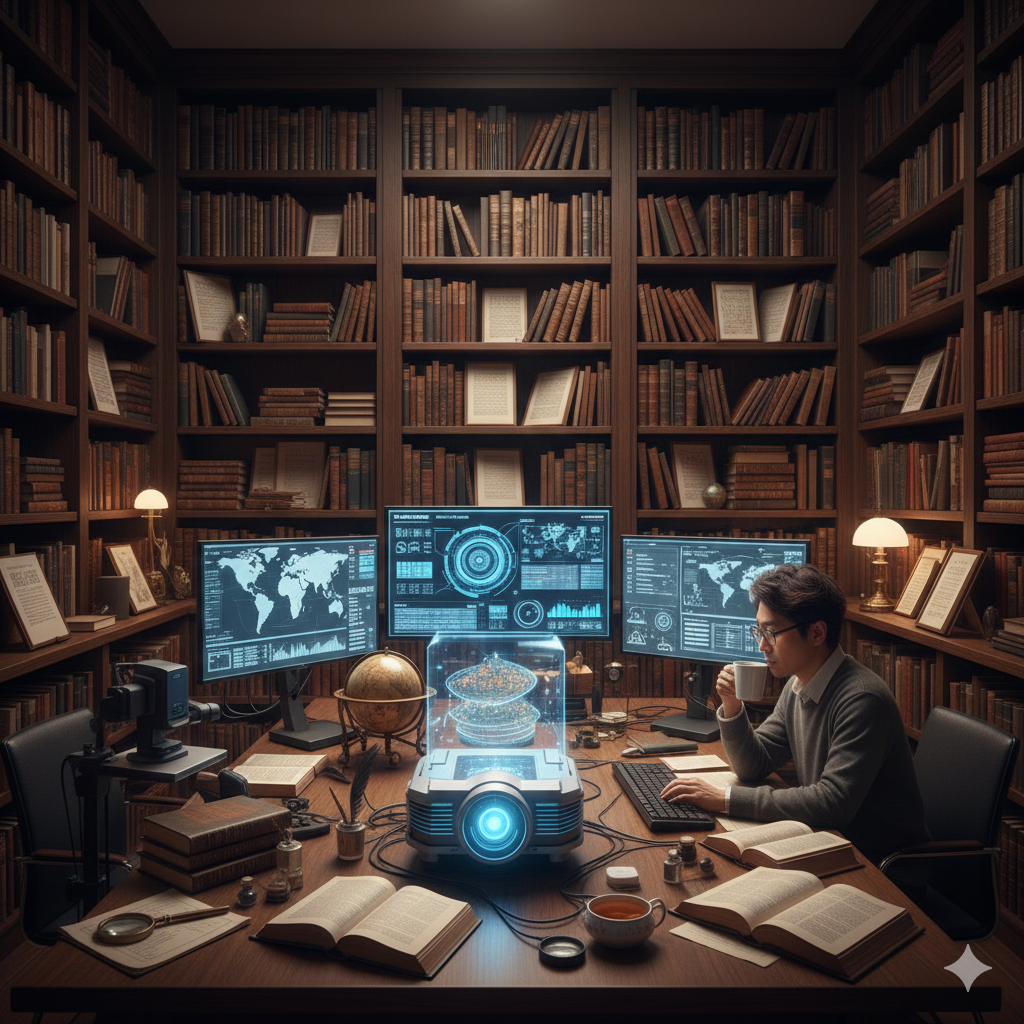 [심층 분석 이미지 정보] 거대한 우주의 도서관 중앙에서 한 지식인이 투명한 홀로그램 지구본을 만지고 있습니다. 지구본 내부에는 톱니바퀴처럼 맞물린 인류의 역사적 사건들이 보이며, 지식인의 손길이 닿을 때마다 어두웠던 사건들이 황금빛 지혜의 코드로 변환되어 우주로 뻗어 나갑니다. 이는 인간의 지성이 역사를 치유하고 완성하는 과정을 상징합니다.