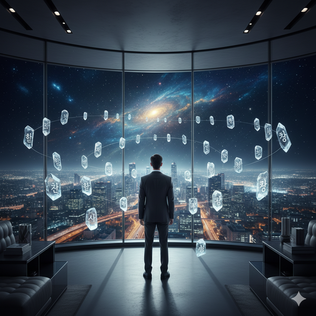 English: A man in a sophisticated dark gray suit looks out a huge panoramic window in an ultra-modern glass penthouse. Outside the window is a fantastic landscape where a brilliant city night view and a majestic cosmic nebula overlap in a 7:3 ratio. Around the man, the 81 characters of Cheonbugyeong shine like transparent crystal fragments floating in the air, and a calm yet overwhelming energy of intellectual insight fills the space.