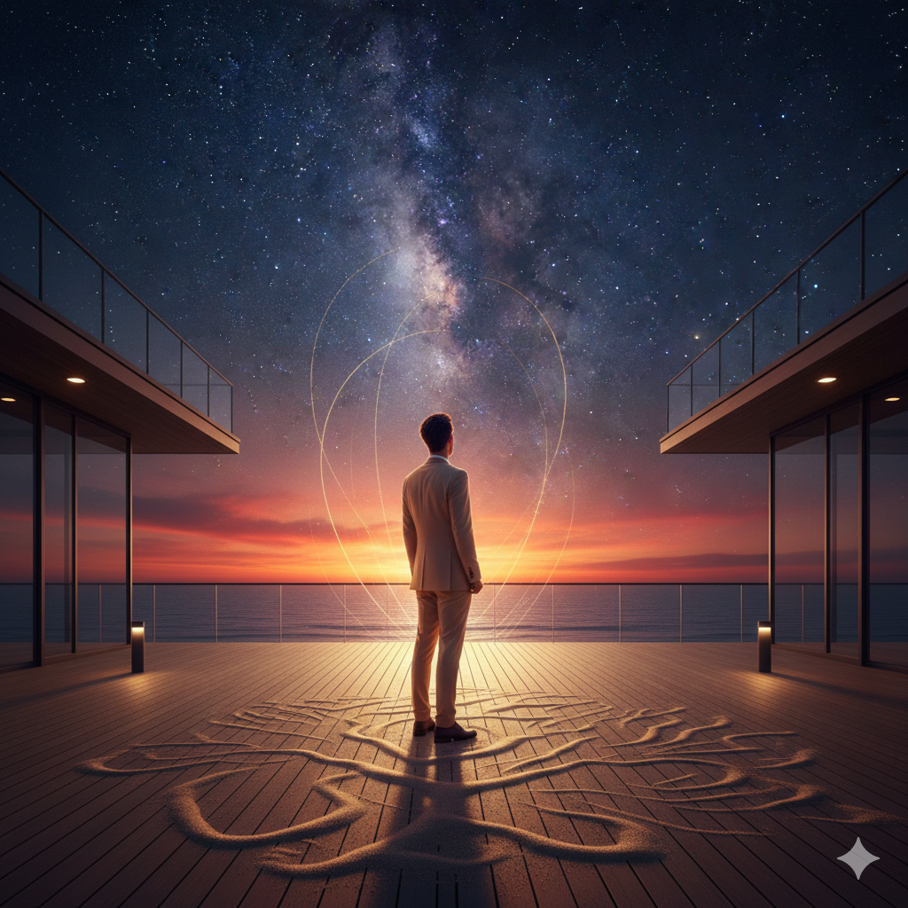 [시 관련 이미지 생성 정보] 한글: 해 질 무렵, 현대적인 디자인의 해변 전망대에서 밝은 베이지색 정장을 입은 한 사람이 지평선 너머로 붉게 물드는 노을과 밤하늘의 은하수가 만나는 장관을 바라보고 있습니다. 인물의 발아래는 지상의 모래알들이, 머리 위로는 우주의 별들이 서로 연결된 듯 금빛 선으로 이어져 있으며, 전체적으로 숭고하고 따뜻한 회귀의 정서를 담고 있습니다.