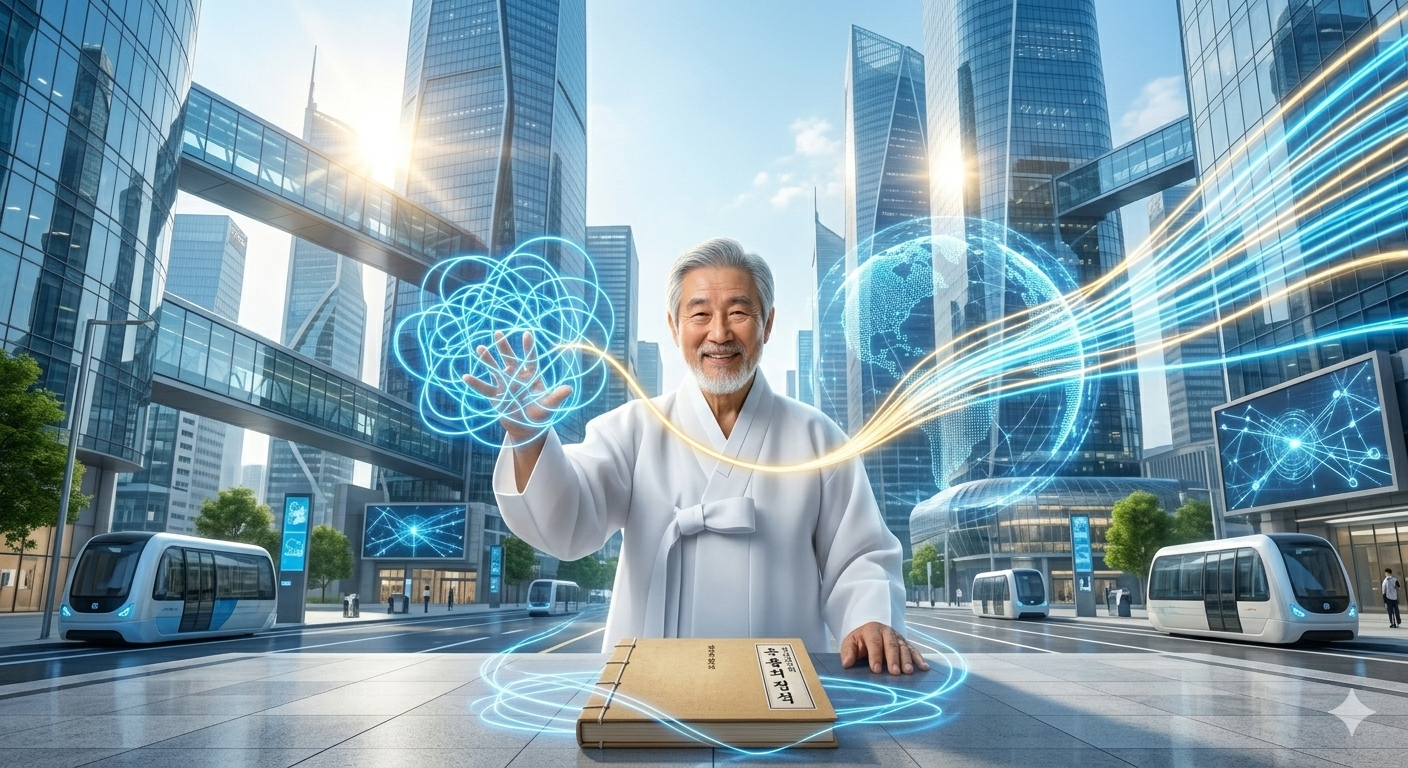 - [English Info] Amidst ultra-modern glass buildings in a city center, a mentor in neat modern Hanbok draws a glowing blue holographic map in the air with a benevolent smile. The lines of the map unravel from a tangled mess into streaks of light spreading across the globe, with a book titled "Principles of Operation" at the mentor's feet. This symbolizes a modern "Cheonson" connecting the global village with new wisdom beyond the old order. (Approx. 295 characters)