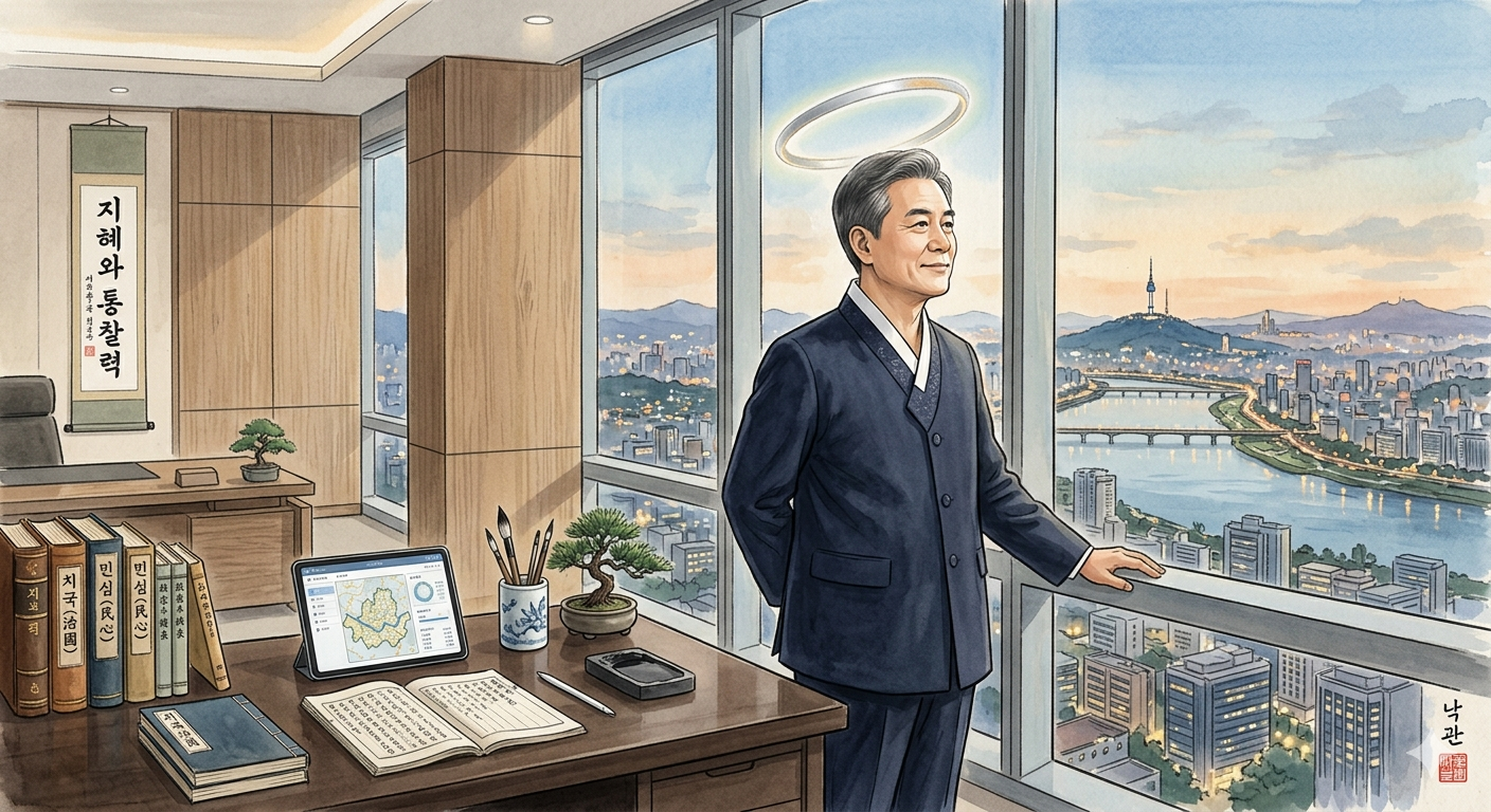 [학술적 해석 이미지 생성 정보] 복잡한 수식과 사회학적 도표들이 홀로그램처럼 떠 있는 가상 공간에서, 정장을 입은 공직자가 거대한 데이터의 흐름을 조율하고 있습니다. 한쪽에는 고전적인 '논어'와 '중용'이, 다른 쪽에는 현대적인 '경제학 원론'이 놓여 있어 학문의 융합을 상징합니다. 청색과 백색의 대비를 통해 차가운 지성과 따뜻한 이념이 공존하는 모습을 세련되게 표현한 수묵 일러스트레이션입니다.