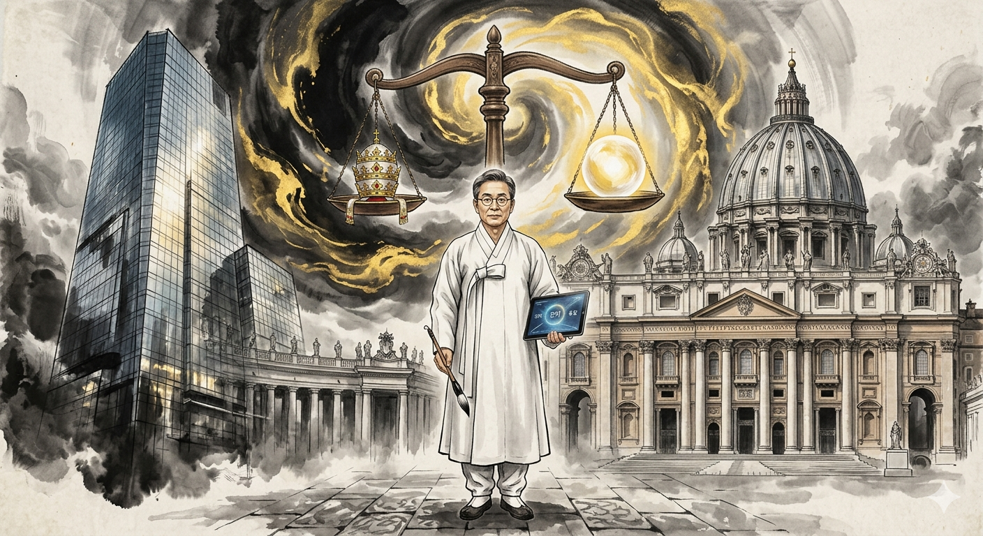 이미지 설명: 현대적인 유리 빌딩과 고대 로마의 바티칸 성당이 수묵화의 농담으로 겹쳐진 초현실적인 배경입니다. 화면 중앙에는 정갈한 흰색 한복을 입고 안경을 쓴 지식인이 서 있으며, 그의 한 손에는 전통 붓이, 다른 한 손에는 현대적인 태블릿 PC가 들려 있습니다. 인물의 머리 위로는 거대한 천칭(저울)이 떠 있는데, 한쪽에는 교황의 삼중관이, 다른 한쪽에는 빛나는 '진리의 원구'가 놓여 팽팽한 균형을 이루고 있습니다. 전체적으로 깊은 먹색과 신비로운 금빛 에너지가 소용돌이치며 권위를 넘어선 지성적 분별의 시대를 웅장하고 세련되게 표현합니다. (300자 내외)